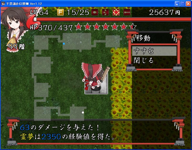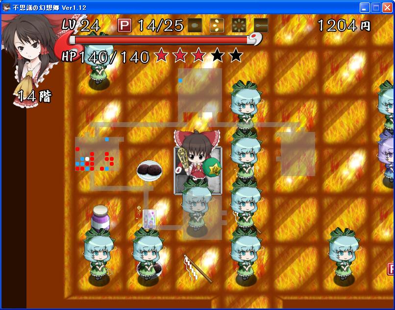 終盤は衣玖というMOBがいるのですが、そのキャラの最上級レベル、衣玖さまの攻撃がとにかくえげつない。フロアにいるだけで攻撃が届き、尚且つダメージ+金縛りというオワタコンボを炸裂してきます。体力が500あっても平気でハメ殺しされます。